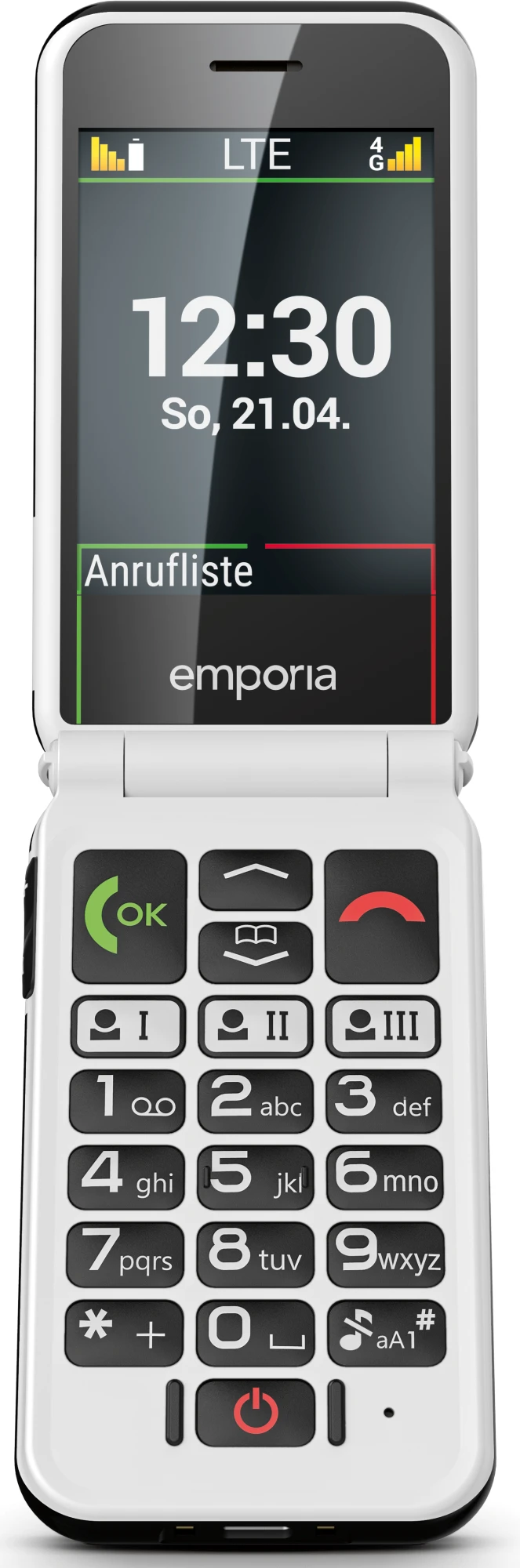 Weiß, schlicht und hochwertig – so sieht das dieses einfache Seniorenhandy von außen aus. Aufgeklappt, spielt es dann all seine weiteren Vorzüge aus. So profitieren Sie bei diesem einfachen Handy für Senioren von Funktionen wie Wecker, Vibrationsalarm, Kalender, Taschenrechner oder LED-Statusleuchten für Akkuleistung, Anrufe oder SMS. Das Gerät begeistert dabei besonders Tastenliebhaber, denn wir haben es mit extragroßen Tasten ausgestattet, die noch dazu beleuchtet und erhaben sind und einen ausgezeichneten Druckpunkt aufweisen. Ebenso gibt es Schnellwahltasten. Weitere Highlights: eine individuell verstellbare Schriftgröße und ein breiter Bildschirm mit gut lesbarer Schrift. Auf der Rückseite finden Sie zudem unseren patentierten Notruf-Button. Im Ernstfall rasch und unkompliziert Hilfe holen – das ist damit immer möglich.